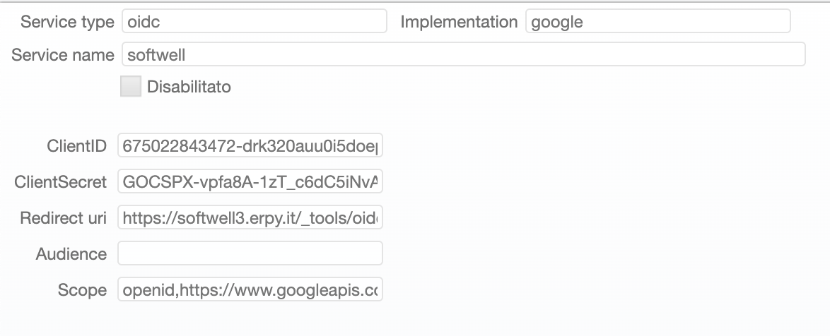 Quale che sia il provider prescelto, dopo la Configurazione , è possibile procedere con la configurazione del service oidc, specificando l’implementazione scelta (Facebook, Google).